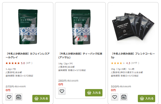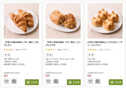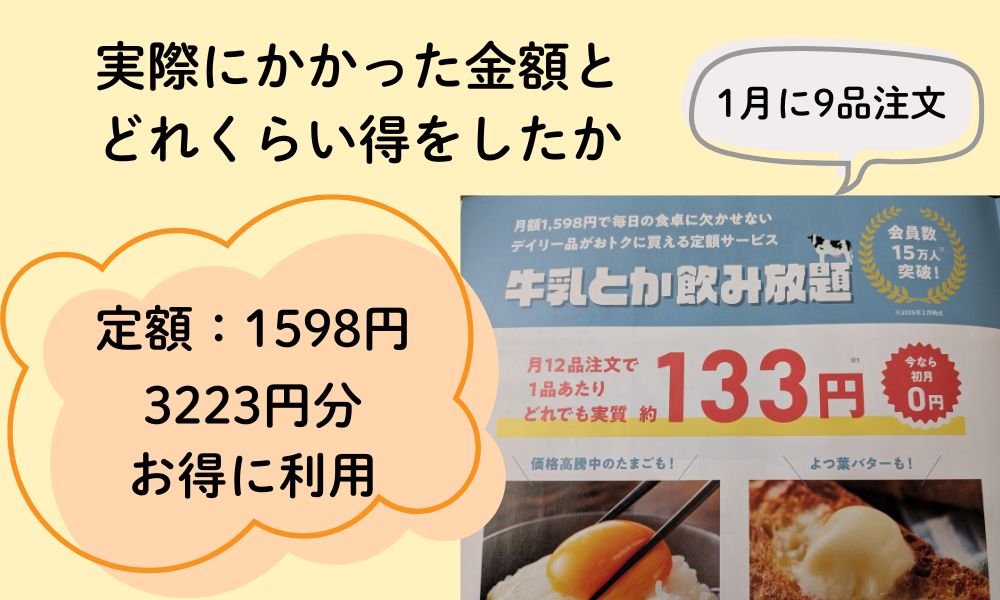 通常は1商品ずつ購入するとそれなりの価格になりますが、「牛乳とか飲み放題」を利用すると、選び方次第で割安に購入できます。