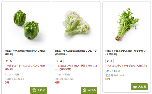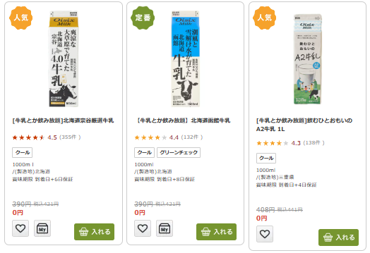牛乳とか飲み放題では、毎週の定期ボックス注文時に、対象商品の中から好きなものを選べます。日常的によく使う食材が中心で、スーパー感覚で選べるのが特徴です。