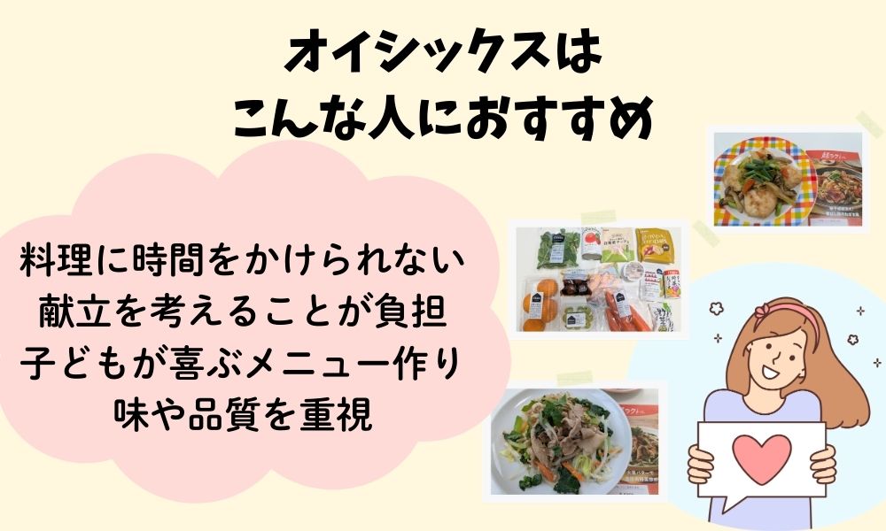 オイシックスは「とにかく安く済ませたい人」よりも、時間・手間・おいしさのバランスを取りたい人に向いているサービスです。実際に使ってみて、特におすすめできるのは次のような方です。