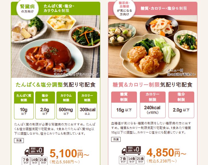 塩分制限・糖質制限・カロリー制限など、目的別にコースが分かれており、自分の体調や医師からの指示に合わせて選ぶことができます。