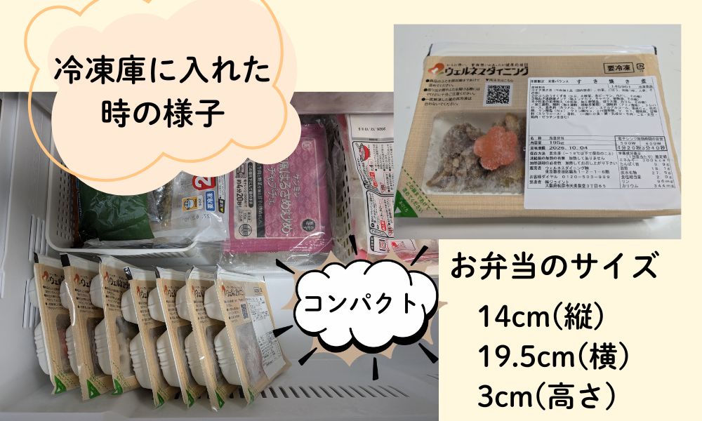 冷凍弁当なので冷凍庫のスペースを確保する必要があります。まとめて届く分、事前に空きを作っておかないと入りきらないこともあります。