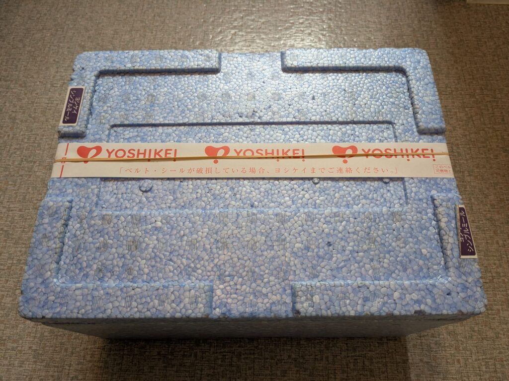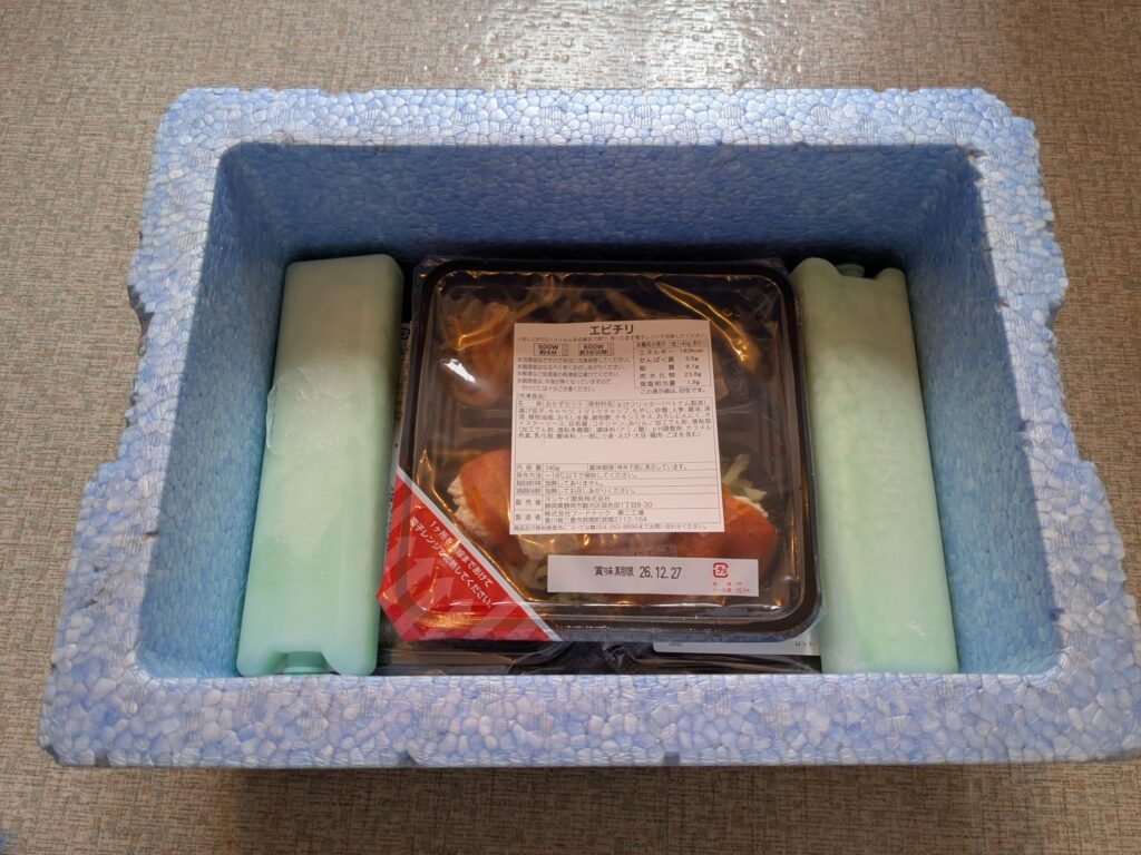 発泡スチロール製の青いボックスが、購入した弁当の配達日に冷凍の状態でまとめて届きます。